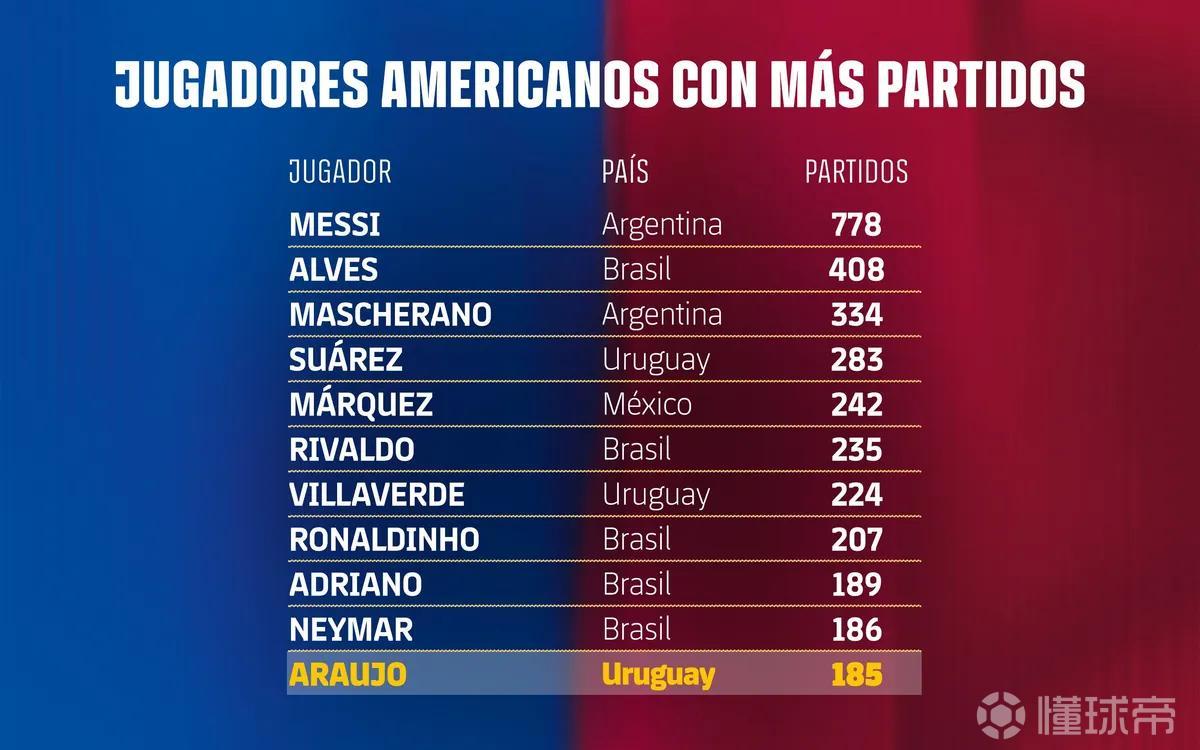 在与皇家马德里的经典对决中,阿劳霍迎来了他在巴萨的第185次温暖亮相,这位来自乌拉圭的坚强后卫,离成为巴萨队史南美球员出场次数前十的荣耀殿堂,只差一场比赛的闪耀。巴萨队史南美球员闪耀出场榜1梅西阿根廷778场,如星辰般璀璨2阿尔维斯巴西408场,稳健如山3马斯切拉诺阿根廷334场,坚韧不拔4苏亚雷斯乌拉圭283场,锋芒毕露5马克斯墨西哥242场,默默耕耘6里瓦尔多巴西235场,技艺超群7比利亚韦德