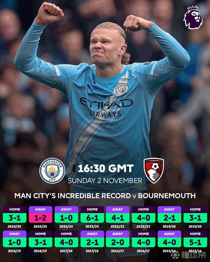 北京时间11月1日,英超官方为即将到来的本周末曼城主场迎战伯恩茅斯的第10轮联赛进行了预热,尽管当前蓝月亮仅位列积分榜第5名,而樱桃军团则高居第2,但两队的历史对决却呈现出明显的单边态势。