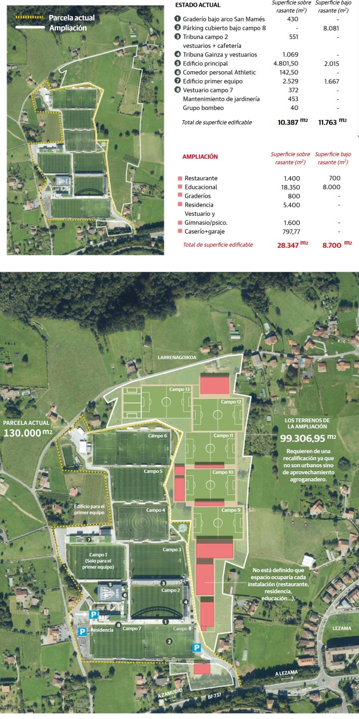 去年春季,市政府初步批准了附属法规的修订,授权毕尔巴鄂竞技在邻近地块上建造总计28,350平方米的地上建筑和8,700平方米的地下室或停车场。如前所述,所有建筑均规划在99,306平方米的地块内。目前,莱萨马基地在130,000平方米的土地上,拥有10,400平方米的地上建筑和11,700平方米的地下建筑。