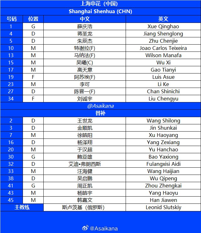 上海申花首发阵容:1号薛庆浩、13号马纳法、4号蒋圣龙、5号朱辰杰、27号陈晋一(持有中国香港会籍,在亚冠赛场上被视为外援)、23号李可、15号吴曦、17号高天意、10号特谢拉、19号阿苏埃、34号刘诚宇