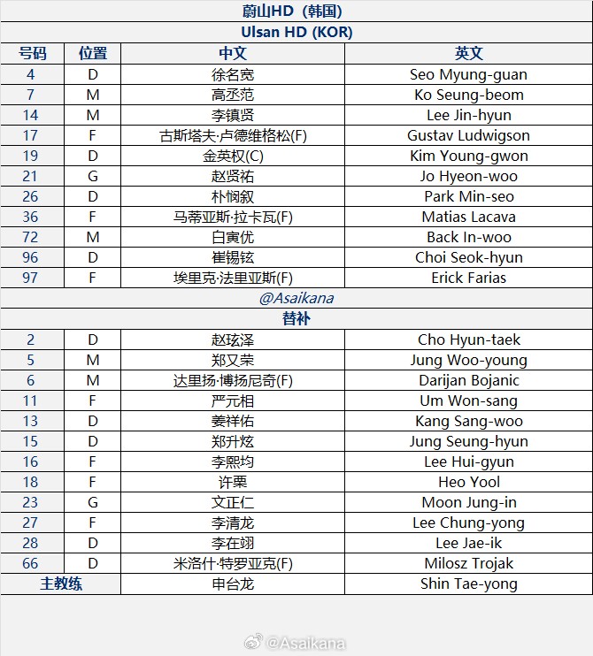 蔚山HD首发阵容:21号赵贤祐、26号朴悯叙、4号徐名官、19号金英权、96号崔锡铉、7号高丞范、14号李镇贤、72号白寅优、36号拉卡瓦、17号卢德维格松、97号埃里克